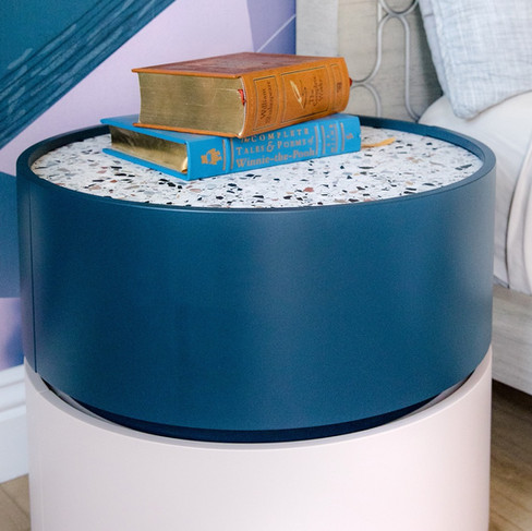 The custom Italian nightstands have a sleek shape and surface, we played with tones of navy and blush pink and finished them off by adding a terrazzo top.