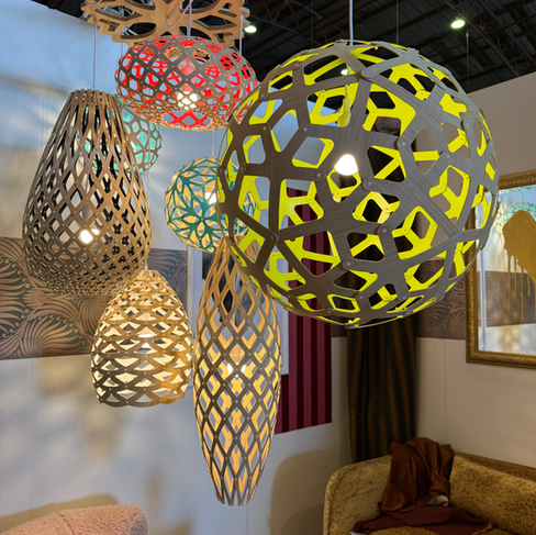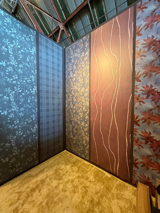 The pieces hung beautifully in the lounge, surrounded by soft green walls, sculptural lighting, and the hum of designers stopping by for demos and sips. The energy was warm, creative, and celebratory.