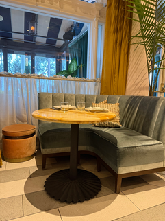Teal façade, golden signage, lush velvet seating, scalloped lampshades, original moldings, gallery-lined hallways, layered patterns, caramel wood tones, and just a whisper of old Hollywood glamour. Serena, the in-house restaurant, carried the same vibe—gold fringe, curved banquettes, and a curated vintage-meets-modern palette.